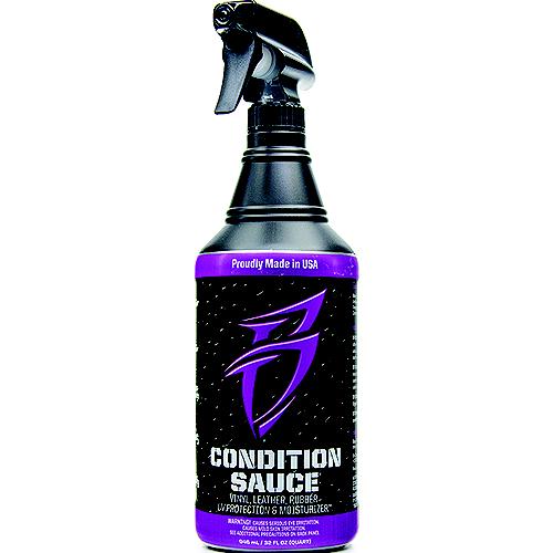 Protect your investment. Unlike generic surface dressings that leave greasy, slippery residue, Condition Sauce is a functional UV protectant designed to block the sun's harmful rays, prevent fading, cracking and discoloration from vinyl, leather, rubber and plastic while moisturizing the material to provide the stunning "like new" look. Simple spray on, wipe off applicationProvides UV protection for vinyl, leather, rubber and plasticProtects against fading, cracking and discolorationContains moisturizers for the stunning "like new" look without a slippery or greasy appearancePerfect for rubber tires, moldings, rubrails, and RV roof seams