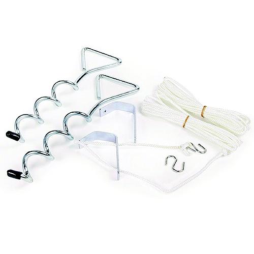 Secure your awning economically. Perfect for use at the beach. The extra holding power of spiral stakes works well in all kinds of soil, and makes this unit ideal for securing in sandy soil. Easy-to-use Awning Stabilizer Kit fits all awning sizes. Made in USA.