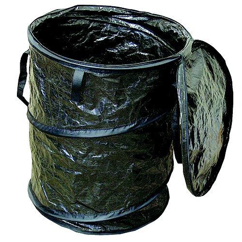 Collapsible utility container is great for laundry, tack or trash, can be easily moved around to accommodate a variety of needs. Features a double liner, padded handles, a lid that zips closed, and a stake to secure it in place. It stands 2 feet tall and provides a sturdy frame for 30 gallon bags. Collapses in seconds to store at just 2" high in its zippered storage bag. Made of heavy canvas and has a bottom handle for easy lifting.