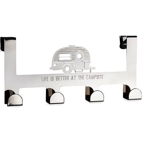 Camco's Life is Better at the Campsite Over the Door Towel Hanger provides (4) hooks for hanging towels, jackets, hats, and more. The perfect solution for small places. The hanger fits standard interior doors up to 1-1/2" thick. Easy to use, no tools required. Features a retro RV design with phrase, "Life is Better at the Campsite". Made of durable stainless steel. 4 hooks for hanging towels, bathrobes, jackets, hats, scarves, purses and more. Ideal for bedrooms, bathrooms and closets.Fits standard interior doors up to 1-1/2" thickSimply hangs over your door - no tools requiredFeatures a retro RV design with the phrase, "Life is Better at the Campsite"