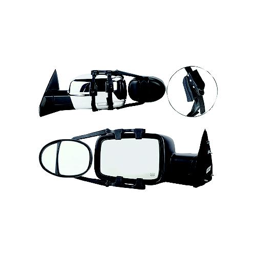 Universal dual lens towing mirror with ratchet mount system. Sold per pair.