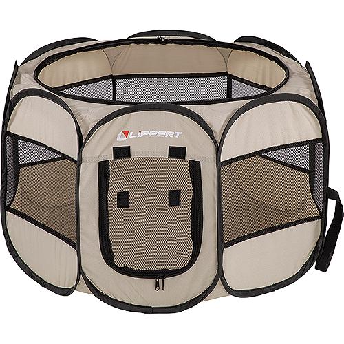 The Lippert portable pet playpen is the perfect pet accessory to use in your RV or take on any adventure - whether you're camping, going to the beach or sitting on the sidelines. Breathable mesh screen walls allow for air circulation and visibilityDesigned with easy-to-clean 600D polyester fabric with PVC coating Zippered top and side entrances for hassle-free accessFoldable for easy transportation and storageMade for indoor and outdoor useIncludes four stakes and convenient carry bag