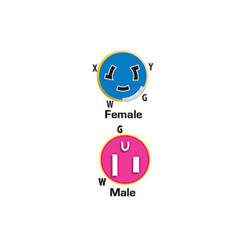Feature power indicator light, contoured grip and thumbprint ground blade locator. Yellow. Female connector is locking with sealing collar, the male is straight blade with locking screw.