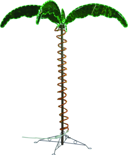 Palm Tree with green leaves; green and yellow LEDs; green and yellow rope; 4.9' (1.5m) white lead wire; trunk and base powder-coated brown; 24 LEDs per meter spaced 4.17m apart; UL approved for indoor/outdoor use and comes with spare fuse. Applications include RV Patio, landscape, pathways and gardens.UL approved for safety. This item is made with V0-class fireproof PVC, pure copper wire, and high-quality LED chips that are cool to touch when lit. It is flexible and easy to install; and the PVC material is resistant to UV light and cold temperatures.