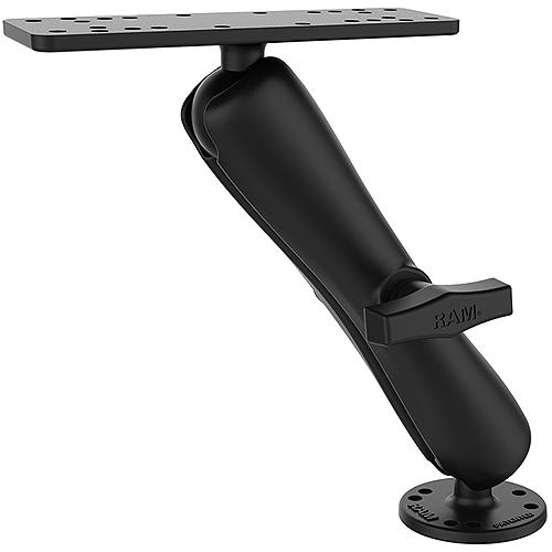 Consists of a 2.5" diameter round base that contains the universal AMPs hole pattern, a double socket arm and 6.25" x 2" rectangle base. The rectangle base contains different combinations of pre-drilled holes which will match up to many electronic devices and mounts, including Marine GPS, CB Radios, Ham Radios, Gimbal Brackets and more. Made of Powder Coated Marine Grade Aluminum.