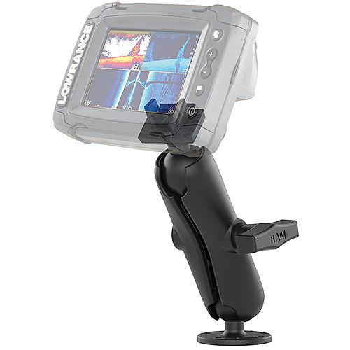 The RAM-101-LO11 consists of a 2.5" diameter round base that contains the universal AMPS hole pattern double socket arm and adapter base that inserts directly to the back of Lowrance Elite-5, Elite-5 Ti, Elite-7 Ti/Ti®, HOOK-3, HOOK-4, HOOK-5 and MARK-5 Fishfinders. The adapter serves as a quick release mechanism, allowing you to remove or transfer your Fishfinder in seconds. Designed into the mount is a 1.5" diameter patented rubber ball and socket system with adjustment points at both socket ends of the arm; this with RAM's rubber ball and socket technology allows for almost infinite adjustment and perfect viewing angles.