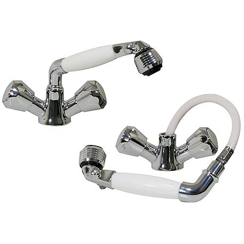 Chrome plated brass body, plastic handle with chromed plastic nozzle and chrome plated brass elbow. Shower/faucet mixerSprayer handle feature on/off valveFlexible supply lines with 1/2" female NPT fittings1-1/2" Mounting holeWhite handle 5' white nylon hose