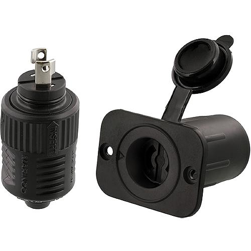 Premium-quality DC Plug and ReceptacleFeatures unique locking blades with the industrys largest surface-area for maximum surface contact and electrical conductivity. ConnectPro® connections are weather resistant.The marine-grade design includes corrosion resistant, plated-brass electrical components, and a watertight sealing cap.The plugs erogonomic, soft-contoured grip allows easy hook-up and blade alignment. An O-ring seals out moisture while plugged into the receptacle. The receptacle has exclusive Perma-Lock terminals, meaning they virtually never need to be retightened.