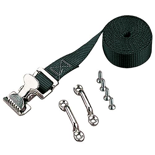 For use in securing a portable gas tank. Gas Tank Strap kit includes: 1" x 6' nylon webbing strap with 304 stainless steel buckle, two 304 stainless steel footman's loops, and four #10 FH fasteners.