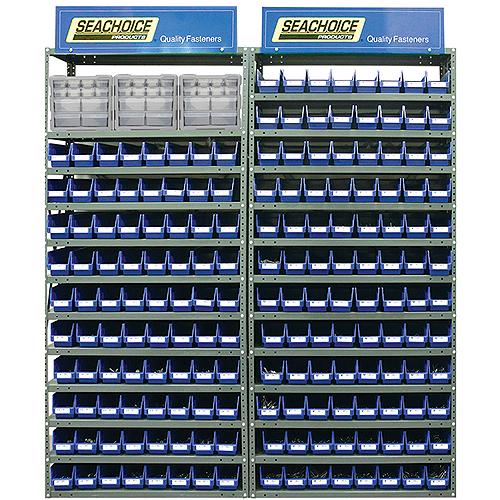 Kit Includes: Variety of popular fastener types and sizes. See seachoice.com for a complete listing(3) Unit Header Signs - Model 01979(1) Bin Labels(2) 18 Drawer Clear Cabinets - Model 01986(3) 13 Shelf Units - Model 01987(12 cases of 24) Blue Bins - Model 01988(12 cases of 24) Bin Dividers - Model 0198913 Shelf Units are manufactured from high-grade, 22-gauge steel with a powder-coated finish. Assembly required: units are easily assembled with the included hardware, and include adjustable shelves w/clips. Capacity: 500 lbs. per shelf.