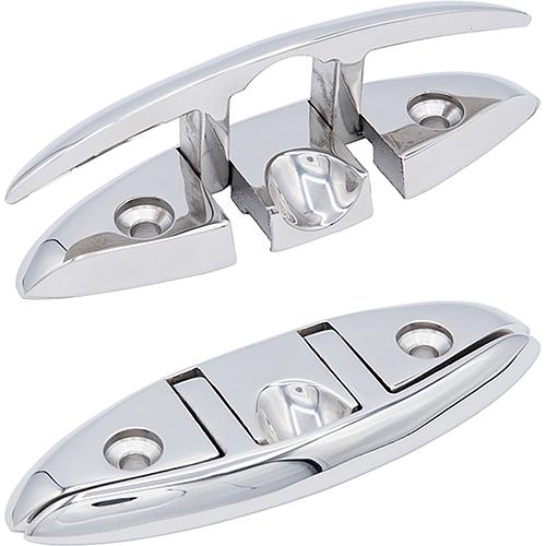 Mirror-polished, premium folding cleat provides a low-profile, ergonomic design for a sleek appearance while minimizing trip hazards. Constructed of corrosion resistant cast 316 Stainless Steel. Surface mount; no cut-outs or hole saws required. Fasteners not included.