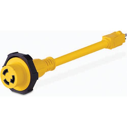 Pigtail adapters allow the user to connect a dockside receptacle to a boatside inlet of a different power configuration. Sierra pigtail adapters are easy to use and perfect for the harsh marine environment. Max Voltage: 125VACCable Size: 10/3 AWGYellow PVC cord jacket with maximum UV inhibitorsJacket Rating: STW 600VAC @ 60°CHigh quality, corrosion resistant nickel-plated brass contactsNylon plug body for high resistance to carbon trackingETL Listed