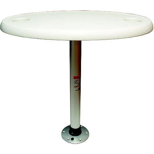 Lightweight, molded heavy-duty marine grade plastic table tops will stand up to harsh conditions. Molded in drink holders. Mounts on included 27" aluminum locking Thread-Lock™ post with locking table mount and aluminum locking base.