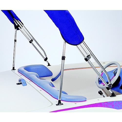 Keep your bimini top off the gunwales with a pair of bimini support poles. These poles replace your rear straps and keep your top "up and out of the way." Two jaw slides (7/8") and deck hinge are included. 1 Pair per card. Note:These poles should never be used to replace the front support straps. Only the rear straps should be replaced with adjustable support poles. Do not exceed 35 miles per hour while using adjustable Bimini top support poles.
