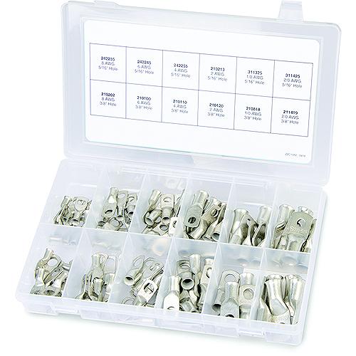 Heavy duty, pure copper for maximum current flow and tinned for corrosion resistance and easy soldering. Closed end to seal out moisture.Includes: (10) 8 AWG, 5/16", (10) 8 AWG, 3/8", (10) 6 AWG, 5/16", (10) 6 AWG, 3/8", (10) 4 AWG, 5/16", (10) 4 AWG, 3/8", (10) 2 AWG, 5/16", (10) 2 AWG, 3/8", (5) 1/0 AWG, 5/16", (5) 1/0 AWG, 3/8", (5) 2/0 AWG, 5/16", (5) 2/0 AWG, 3/8".