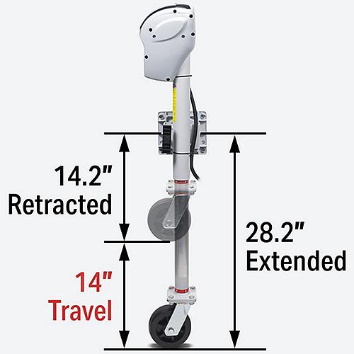 1,500 lb. Max Load 1,500 lb. Max LoadRaise and lower the jack with the push of a buttonWorks 9X faster than a manual crank jackLED light illuminates nighttime hookupsWaterproof touch panel for longer switch lifeIP58-rated, sealed motor and electrical componentsCorrosion-resistant aluminum constructionPassed 1,000-hour salt-spray test28.2" Extended height with 14.2" of travelHeavy-duty 6" wheel allows mobility in any direction7-Way connector included