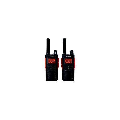 The Cobra RX680 contains a pair of rugged, splashproof walkie talkies that are perfect for most outdoor conditions. With up to 38-mile range, Splashproof (IP54) Rating, NOAA Weather Alerts, built-in LED flashlight, and more, the family-friendly RX680 walkie talkies are ideal for outdoor adventures. Easy access to 22 standard FRS channels + 38 pre-programmed channel/privacy code combinationsHands-free usage to automatically transmit when you speakEnhanced vibrating feedback to notify you of incoming transmissionsUp to 18 hours of continuous usage (90% standby / 5% talk / 5% listen)Charging dock and micro USB cable only