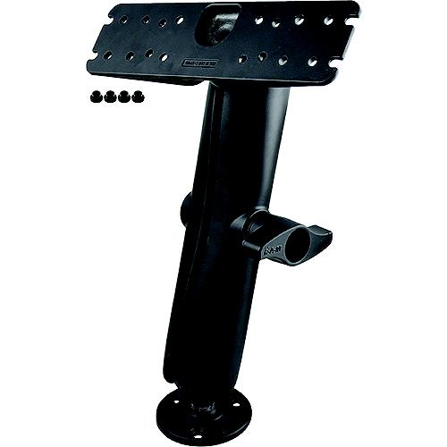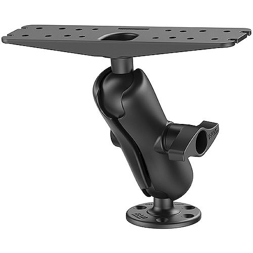 A 3.68" diameter round base, double socket arm and 11" x 3" rectangular plate. The round base has pre-drilled holes, including two holes at 180° and three holes at 120°. The plate has different combinations of pre-drilled holes which will match up to many electronic devices and mounts, including Marine GPS, CB Radios, Ham Radios, Gimbal Brackets and more.