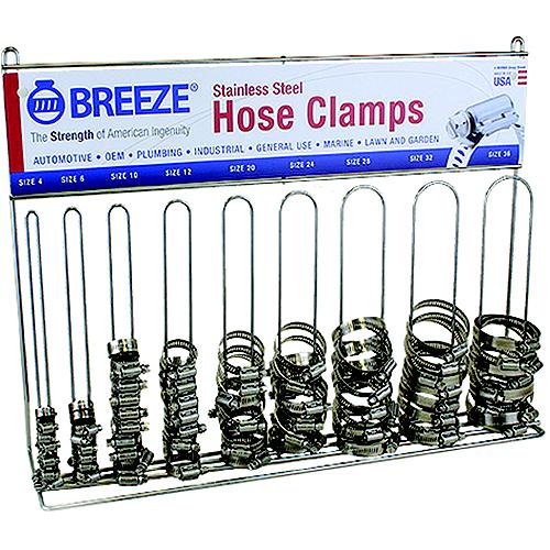 Contains 90 assorted Breeze 316 Power-Seal and 316 Mini stainless steel hose clamps and display rack. Includes 1 box (10ea) of sizes 4, 6, 10, 12, 20, 24, 28, 32 & 36.