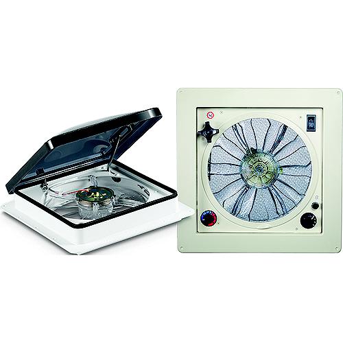 Three Speed; Reversible with Thermostat. Select speed (1-low, 2-medium or 3-high). Placing the IN/OUT switch in the center (neutral) position can turn off fan blade. The fan will operate at one of three preselected speeds when the thermostat calls for cooler air. Once the thermostat is satisfied, the fan shuts off automatically. Designed to ensure consistent temperatures. With Polar White GarnishQuiet, 12V ceiling fan with 3-speedsSmoke Polycarbonate domeManual Lift DomeThermostat Blue to Red Label, 22°F-123°F rangeRemovable screen for easy cleaningReversible fan blade motor (in or out)Low AMP draw ensures full-time useRooftop weight: 11lbs.Dimensions: 16-1/2 x 16-1/2 x 4-1/2 (Fits Most Standard 14" x 14" Openings)Lifetime Warranty on Dome (Freight charges after 2 years)2 Year Warranty on all other components