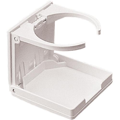 Folding Drink Holder folds to a closed depth of 15/16". Accommodates drink containers up to 2-3/4 in diameter. Impact resistant injection molded ABS construction. Installs with four #6 FH fasteners (not included). Available in black or white.