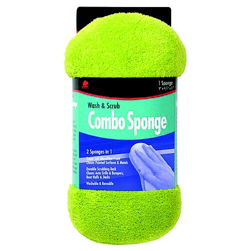 Heavy-duty. Two sponges in one. Super soft microfiber front cleans painted surfaces & metals. Durable scrubbing back cleans auto grills & bumpers, boat hulls & decks. Sponge interior.