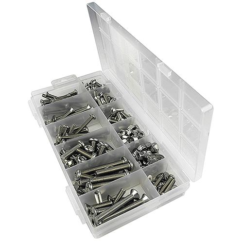 Stainless Steel assortments are packaged in compartmented strong, clear plastic re-closable storage cases. Kit Contains:(6) 8-32 x 1/2" pan mach.(6) 8-32 x 3/4" pan & oval mach.(6) 8-32 x 1" pan & oval mach.(4) 8-32 x 1-1/2" pan & oval mach.(4) 8-32 x 2" pan & oval mach.(8) 10-24 x 1/2" pan mach.(8) 10-24 x 3/4" pan & oval mach.(8) 10-24 x 1" pan & oval mach.(4) 10-24 x 1-1/2" pan & oval mach.(4) 10-24 x 2" pan & oval mach.(6) 1/4-20 x 3/4" pan mach.(6) 1/4-20 x 1" pan & oval mach.(4) 1/4-20 x 1-1/2" pan & oval mach.(4) 1/4-20 x 2" pan & oval mach.(8) 8-32 nylon insert locknuts(8) 10-24 nylon insert locknuts(8) 1/4-20 nylon insert locknuts(12) 8-32 hex nuts(12) 10-24 hex nuts(12) 1/4-20 hex nuts(20) #8 flat washers(20) #10 flat washers(20) 1/4" flat washers