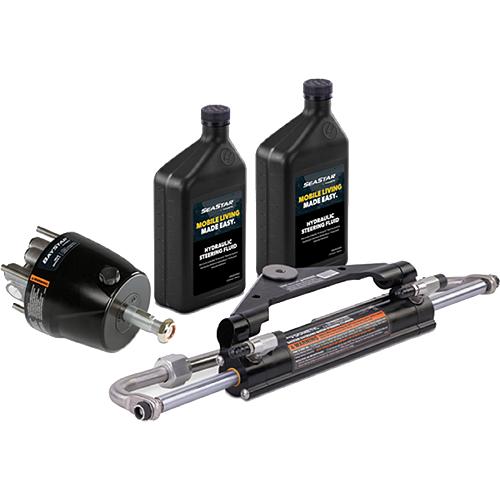 Application: BayStar is for single-outboard powered boats rated up to 150 HP, including runabouts and inflatables and outboard engines with ABYC standard engine tilt tubes up to 150 HP (total). For single station, single engine use only. BayStar is not intended for high speed, high performance type boats.Helm and cylinder equipped with adjustable O-ring fittings to simplify the installation process and allow for simple reorientation of the fittings after installation. Two year warranty. Requires 5" H x 6" D x 21" W minimum splashwell5 Turns lock-to-lockBalanced cylinder fits most splashwells5" footprint; needs only 3" hole (Standard or Tilt)Complete with helm, cylinder, fittings, tubing, oil, fill kit & instructionsStandard 3/4" tapered shaftMeets A.B.Y.C. standards and meets NMMA certification requirements^Kits Includes:BayStar Helm 1.4 cu with adjustable O-ring fittingsHC4645H3 - BayStar Compact CylinderHA5430 (2) - Hydraulic Oil (1 liter)