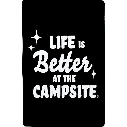 The Life is Better at the Campsite, RV Door Window Light Blocking Shade protects your RV interior from the sun and helps keep the interior temperature cooler in hot weather. This shade also provides additional privacy by blocking unwanted outside views. The fun design features large "Life is Better at the Campsite" text with retro stars. and is made of black nylon ripstop with a silver reflective backing. Includes hook and loop fasteners for easy installation. Measures: 25-1/4" L x 16-1/4" W.