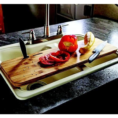 Camco's RV/Marine Bamboo Over the Sink Cutting Board maximizes your RV or boat's kitchen workspace. It is ideal for cutting vegetables, fruits, meats and cheese. This cutting board helps increase counter space and is convenient to use on half sink configurations. It is constructed of durable, 3-ply bamboo that is simple to clean and maintain. Bamboo is easier on knife blades, helping to keep them sharper longer. It includes (4) adjustable, non-slip feet to fit over your sink. (2) built-in knife slots allow easy knife holding. 24" x 8" x 1-3/8" H. Maximizes your RV or boat's kitchen workspace. It is ideal for cutting vegetables, fruits, meats and cheeseHelps increase counter space and is convenient to use on half sink configurationsDurable 3-ply bamboo is simple to maintain and is easier on knife blades - helping to keep them sharper longer