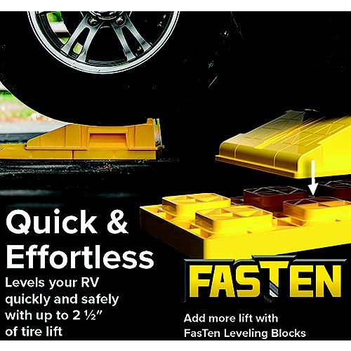 Achieve faster, more reliable RV or trailer leveling with Camco's FasTen Premium RV Leveling Ramp Kit. Set of two durable heavy duty tire ramps allows you to confidently achieve perfect leveling with minimal effort. Features a secure tire curve for maximum grip and an AccuPark ridge, allowing for fast and accurate parking every time. Built-in T-handle ensures easy positioning and storage. For enhanced stability, these are compatible with FasTen Camper Leveling Blocks, though perform exceptionally well on their own. Made in USA