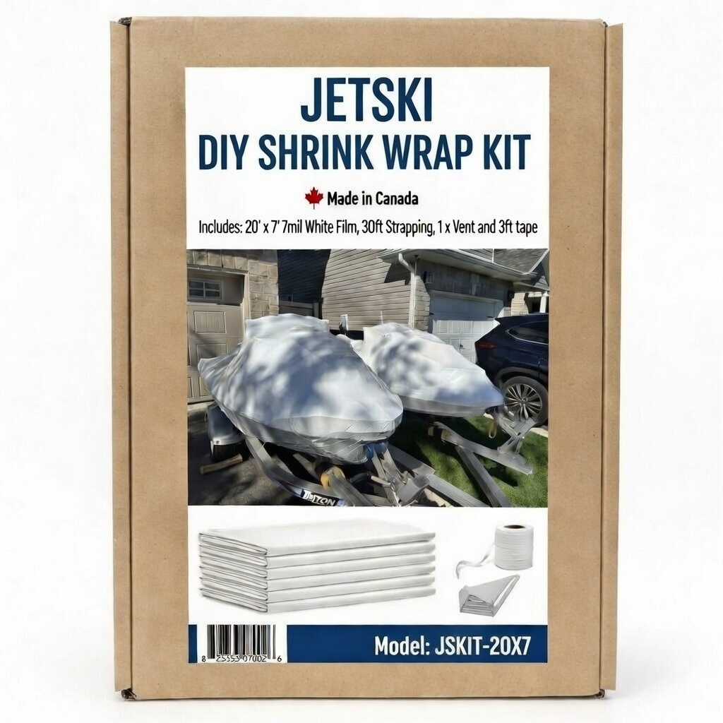 For 1 Jet Ski / Sea-Doo Shrink Wrap Kit for personal watercraft (PWC) winter storage, outdoor protection, and transport. Includes shrink wrap film with UV inhibitors for added sun resistance.