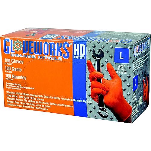 AMMEX Gloveworks HD Orange Nitrile Powder Free Industrial Gloves are designed and engineered to handle the toughest jobs. Their raised diamond texture provides an unbeatable grip by channeling away liquids. Excellent puncture and chemical resistance. Latex free. 8- to 9-mil thickness with superb dexterity.