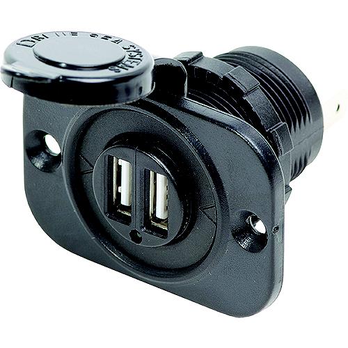 Charge two mobile devices on the go. Easy to install in existing 12V DC socket hole providing convenient access for charging mobile devices. Protective cap with tether keeps out dust and spray. Compatible with popular mobile devices. Cut out dimension: 1-1/8" diameter hole. Made with corrosion resistant materials which ensure a solid contact and low voltage drop.Fits in same mounting hole as a traditional 12 Volt outletCompatible with most mobile devices including Apple® productsProtective dust cap with tether keeps dust and spray from shortening the life of the chargerConformal coated circuit board to stand up to harsh environments2A Supply fuse is not included