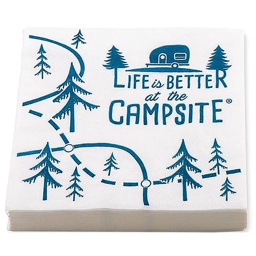 Camco's Life is Better at the Campsite Paper Napkins are soft and absorbent-great for everyday meals and special occasions. These 2-ply napkins measure 6-1/2" x 6-1/2" folded; 13" x 13" unfolded. They feature a unique camping design. Quantity: 30 count. Perfect for Parties or Camping: Soft and absorbent paper napkins are great for everyday meals or special occasions