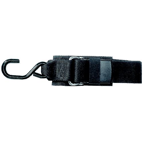 Rugged 4' transom tie down. Wear resistant polypropylene webbing withstands the many rigors of the road and the marine environment. A cam-over lever locks the webbing in place. Backing the lever is a webbing pad that prevents scratches on the boat surface. Webbing "fingers" attached to the pad secure loose tie down ends with hook-and-loop fasteners. Vinyl-coated hooks protect boat and trailer finishes.