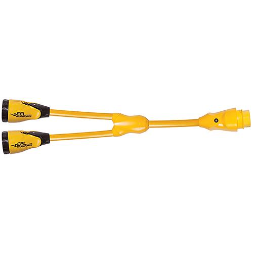 Y-Adapters enable you to split one dockside receptacle between two boat inlets of similar or dissimilar power configurations. Y-Adapters enable you to split one dockside receptacle between two boat inlets of similar or dissimilar power configurations.Sealing collar to create a weatherproof seal when joining cables togetherSuitable for use in wet locationsWatertight molded plug and connector ends for safety and durabilityHeavy-duty, super flexible marine grade cable (30 Amp 10 gauge, 50 Amp 6 gauge)LED power indicatorCorrosion-resistant, nickel-plated contacts5 year warrantyMarine UL® listed