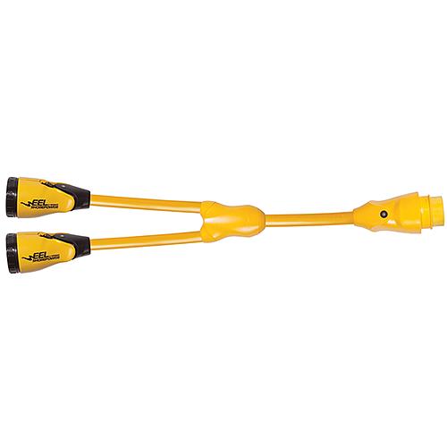 Y-Adapters enable you to split one dockside receptacle between two boat inlets of similar or dissimilar power configurations.Sealing collar to create a weatherproof seal when joining cables togetherSuitable for use in wet locationsWatertight molded plug and connector ends for safety and durabilityHeavy-duty, super flexible marine grade cable (30 Amp 10 gauge, 50 Amp 6 gauge)LED power indicatorCorrosion-resistant, nickel-plated contacts5 year warrantyMarine UL® listed