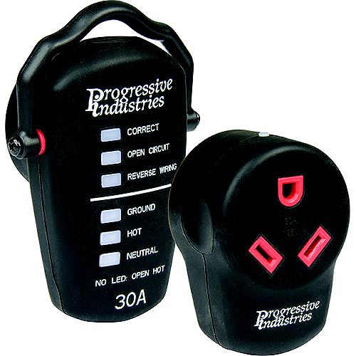 Portable surge protector kits contain a separate receptacle tester to detect wiring faults at the pedestal and surge module to attach to the detachable power cord. Separating the two functions reduces the size of the product while increasing protection from inclement weather. Kit contains receptacle tester and surge module.