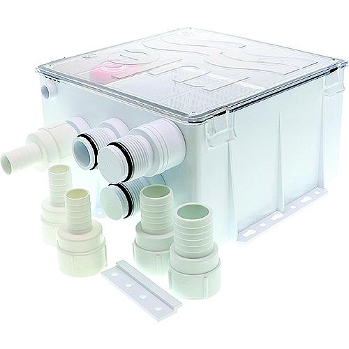 The shower drain box includes a polycarbonate snap lid cover, gasketed cover, several mounting options, cut guides and drill points, friction fit pump and switch, threaded port fittings, easy clean strainer, and a larger joker valve. Several combinations of port fittings are included such as 3/4", 1", 1-1/8", straight and 90° elbow fittings.