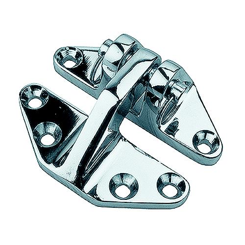 Heavy Duty Hatch Hinge features a removable clevis pin with split ring for easy separation. Hinge design includes stop to hold hatch in upright position when open. Constructed of chrome-plated forged brass for corrosion resistance and durability. Easily installed with eight #10 FH fasteners (not included). Sold Individually.