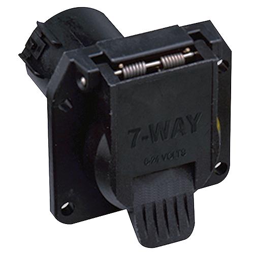 Designed for use with RV and heavier utility & equipment trailers equipped with electric brakes. Attachment holes align with most industry mounting brackets. Direct replacement for factory 7-way connectors on most Audi, Chrysler, Dodge, Ford, Jeep, Porsche, Ram, Toyota and Volkswagen vehicles equipped with trailer tow package wiring. Supports tail lights, stop & turn lamps, trailer brake 12V+ feed and auxiliary connectionsPotted connector terminals and gasketed spring-loaded door for strong weather-resistant designPlastic connector body resists corrosionEasily snaps onto mating harness assemblyCompatible with RV-style 7-way trailer connectors30 Amp max load