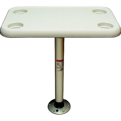 Lightweight, molded heavy-duty marine grade plastic table tops will stand up to harsh conditions. Molded in drink holders. Mounts on included 27" aluminum locking Thread-Lock™ post with locking table mount and aluminum locking base.