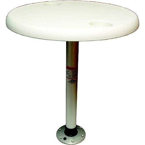 Lightweight, molded heavy-duty marine grade plastic table tops will stand up to harsh conditions. Molded in drink holders. Mounts on included 27" aluminum locking Thread-Lock™ post with locking table mount and aluminum locking base.