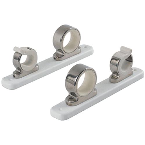 Rod-tip spring design securely locks rods in positon. Easy to install UV stabilized polyethylene racks available in two sizes for convenient 2-rod and 4-rod storage. Pre-drilled recessed mounting holes and beveled edges for clean, attractive look.Can be mounted horizontally, vertically or overheadSpring locking rod tip holderPolished stainless steel/Delrin rod hanger componentsUV-stabilized poly racks w/beveled edges offer a finished look