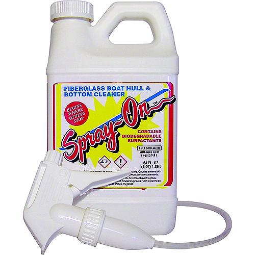 Spray-On quickly removes scum, lime deposits, oxidation and waterline stains from most fiberglass surfaces. Simply spray on and hose off. 64fl.oz-full strength and will make up to 1 gallon or more for lighter duty cleaning. 3-finger home & garden trigger sprayer included. For new appearance and protection, follow with Toon-brite, Protective clear-coat.