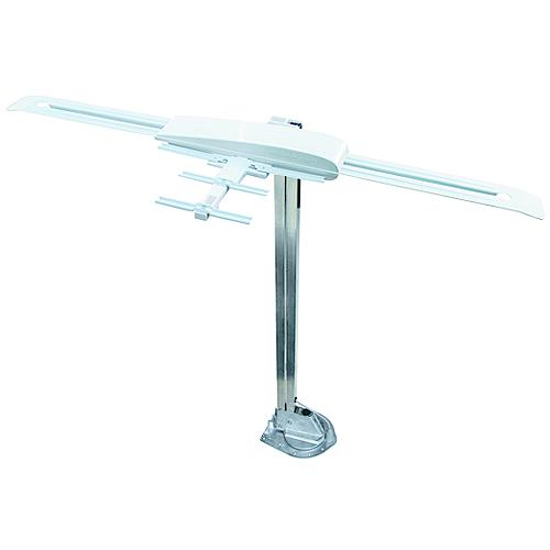Winegard has taken the powerfully performing Sensar III antenna and integrated it with the UHF enhanced Wingman® antenna for the ultimate in over-the-air TV viewing! Optimized for the new DTV spectrum, this amplified antenna with the Wingman UHF upgrade integrated into the Sensar head receives all available VHF/UHF channels so you can enjoy watching all your favorite local programs while parked. Raise, lower and rotate the antenna with hand crank from inside your RV. It's easy to install and lowers to only 4" above the roof while traveling. Integrated Sensar head requires 46.25"L x 15.25"W, unobstructed roof space while stowed. RVW-395 includes amplified antenna and lift assembly, +12 VDC white power supply with on/off switch, white interior control parts and 20 feet of 75 ohm coax cable. U.S. patent D620,483.