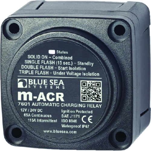 Automatically combines two battery banks during charging and isolates batteries during discharge or starting to protect sensitive electronics. LED light indicates ACR states. Surface, rear, or front panel mounting options and a snap-on cover insulates terminal connections to prevent short circuits.
