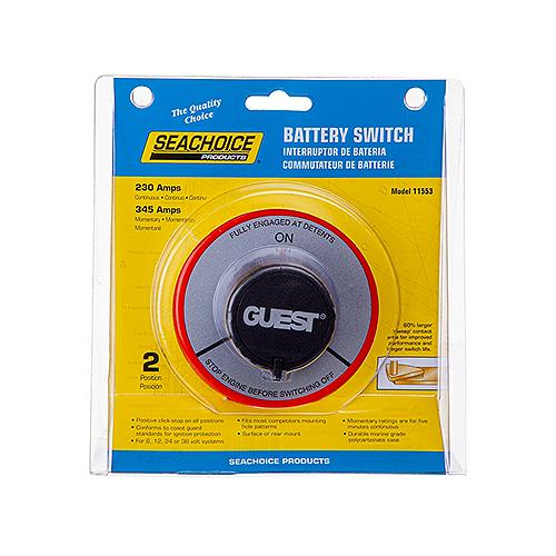 This Seachoice Battery Select Switch allows a boater to control whether power can be drawn from a battery, helping to prevent inadvertent battery draining when a boat is not in use. This two-position switch offers the choices of On and Off so it is certain whether power can be drawn from the battery. There is a positive click-stop on both positions for the most dependable operation. This switch does not have a lock. It is designed for use with 6-, 12-, 24-, and 36-volt systems, and is rated for 230 amps continuous, 345 amps momentary (5 minutes). It conforms to U.S. Coast Guard standards for ignition protection. This switch features a 60% larger sweep contact area for improved performance and longer switch life. It has a durable, marine-grade polycarbonate case, and can be surface- or rear-mounted. Its mounting holes match most other switches' mounting hole patterns. This switch has a 5 ½-In. diameter and is 2 5/8-In. high. Its cable lug size is 3/8-In. Seachoice is committed to delivering quality marine accessories and OEM replacement parts to satisfy fishing, boating and watersports enthusiasts worldwide. Seachoice is run for and by boaters, offering a wide-ranging product line while remaining affordable. Controls whether power can be drawn from battery to prevent inadvertent battery draining when boat is not in useTwo-position switch (no lock) with positive click-stop on both positions: On/OffFor use with 6-, 12-, 24-, and 36-volt systems; rated for 230 amps continuous, 345 amps momentary (5 minutes)Conforms to U.S. Coast Guard standards for ignition protection5 ½-In. diameter x 2 5/8-In. high; cable lug size of 3/8-In.Manufacturer part number 50-1155360% larger ?sweep' contact area for improved performance and longer switch lifeDimensions: 5-1/2" dia. x 2-5/8", Cable Lug Size: 3/8"Fits most competitors mounting hole patterns