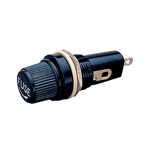 AGC Fuse Holder with Screw-On Cap is constructed of molded Bakelite with stamped brass contacts and a screw-on cap. Panel mounted to provide overcurrent protection in electrical circuits. For use with standard AGC 1/4" x 1-1/4" glass style fuses. Maximum 15A @ 12VDC. Solder terminal. Fuse not included.